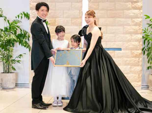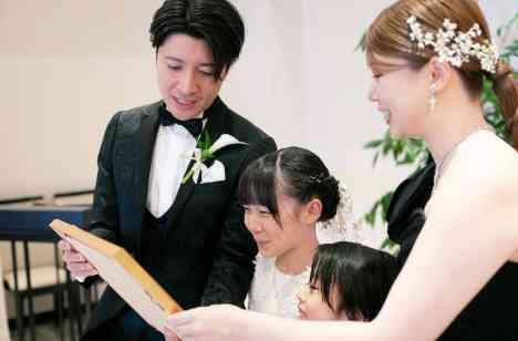 結婚10周年を迎えたおふたりが改めて結婚式をしようと思われたのは、新婦のお父様の「花嫁姿が見たい」という言葉がきっかけ。家庭を築いてきたおふたりだからこそ伝えられる感謝の思いがある。この節目である10年目に、身内だけを招待して結婚式を挙げ、伝えよう…そんな風に思われたのです。素敵なパパとママの姿に終始笑顔のお子様がとても印象的です。結婚式は家族4人で祭壇に立ち、ご親族の皆様へ誓いを立てられました。