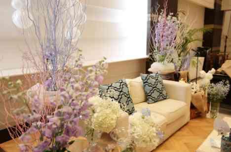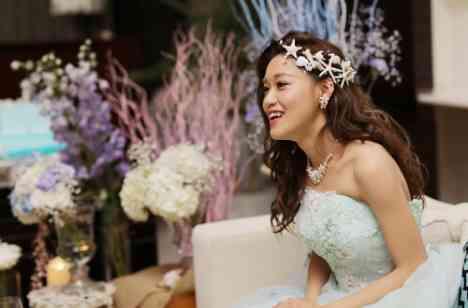 新婦様が大好きな「リトルマーメイド」の世界観を表現するために会場コーデイネートをご提案。お色直しでお召しになるカラードレスも海の世界をイメージ出来そう。そして新婦様のお姉様手作りのヘアアクセはさらにマーメイド感を増すアイテムになりました。