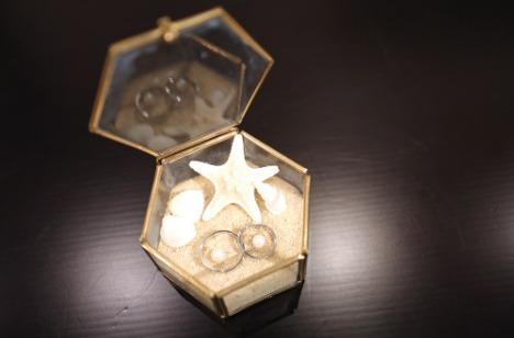 シンプルに愛を誓うキリスト教式を選択されたおふたり。「水の教会」にもピッタリな、海を想像できる素敵なリングピローをご用意されました。シンプルだけど「ふたりらしい」アイテムは、新婚生活でもさりげなくインテリアとして活躍しそうです。