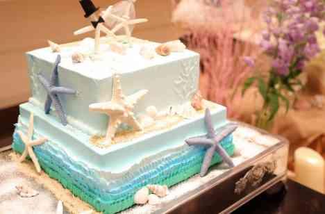 ゲストのお写真や記憶にも残るウェディングケーキは、メイン装飾と一体感のあるものに。写真映えもするブルーと海のアイテムをちりばめたウェディングケーキは、まさに「ふたりらしい」世界に一つのウェディングケーキとなりました。