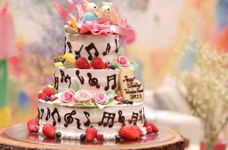 おふたりの大好きな音楽とカラフルなイメージを表現したウェディングケーキをご提案。おふたりのご希望やウェディングコンセプトに合わせて、専属パティシエがデッサンから起こします。メインのカラフルな雰囲気にとても合っていて、ゲストの皆様にも好評でした。
