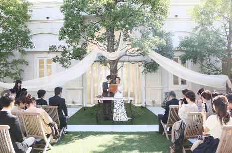 お天気も良く爽やかな気候の中、シンボルツリーのもとで、誓いの言葉を読みあげ、指輪の交換や署名をされたおふたり。結婚証明書にはゲスト一人一人の承認の印が付いた手作りの承認ボードを作成されました。感動的なシーンに涙されるゲストもおられましたが、ゲストの笑顔と拍手に包まれた素敵な空間となりました。