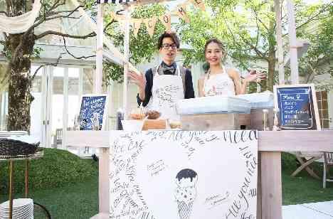 アイスクリームが大好きな新婦様にちなんで。ウェディングケーキもアイスクリームのケーキで。ファーストバイトももちろんアイスクリーム。さらにパーティーの後半には人気のデザートブッフェをご準備されたおふたり。スペシャルメニューとしておふたりが振舞うアイスクリームブッフェもご用意させて頂きました。お揃いのエプロンを身に着けてゲストへおもてなしされる様子は、ゲストにも喜んで頂けたようです。