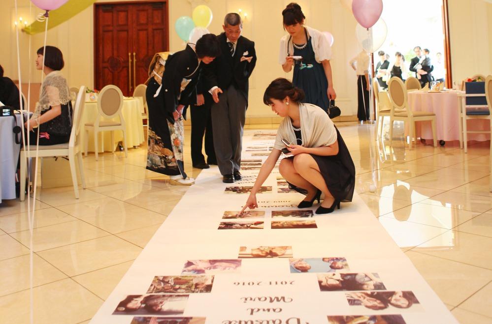 成人式までお互いのことを知らなかったふたりが、実は幼稚園の頃から一緒だったと1枚の写真で気づきます。 ここまで別々に歩んできてつながったお二人の人生をヒストリーロードとしてパーティー会場の中央に表現しました。 そんなおふたりの軌跡を、なつかしくご覧になられるご両親やご姉妹。 そしてそれぞれのゲストの皆様。 会場全体が温かい雰囲気に包まれていました。