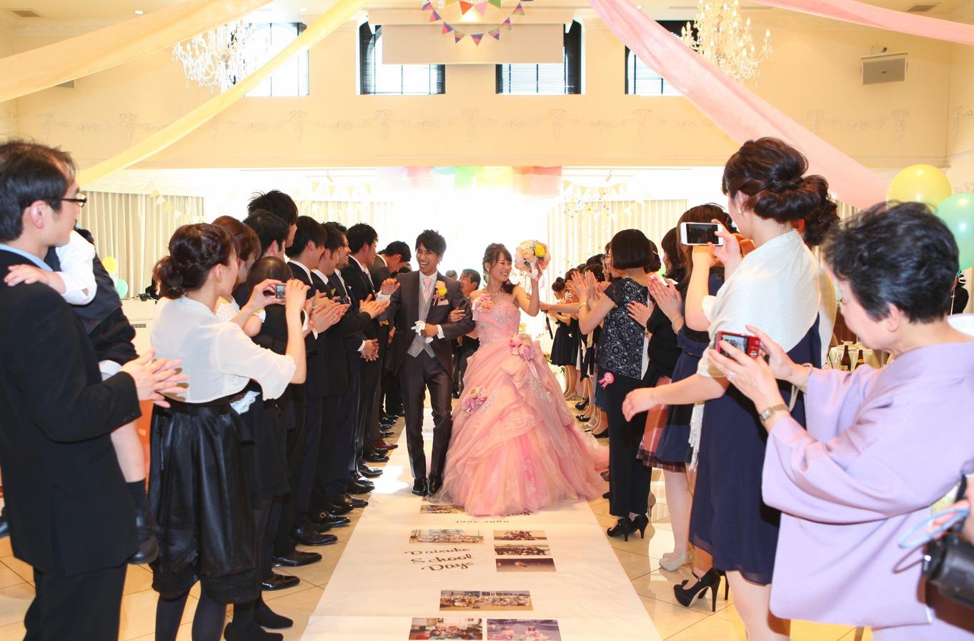 結婚式は様々な方が一つにつながった奇跡の場所。だからこそアットホームに、そしてみんなが参加できるものにしたい。そんな思いで演出や装飾を考えてきたお二人。 最後はそんなゲストを近くに感じながら、ヒストリーロードの上を歩みながらの退場となりました。