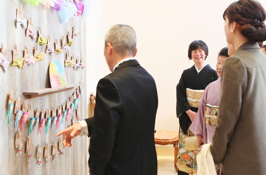 コンセプトにもある「虹」。幼いころから様々なカラーを身に着けてきたおふたりはそのカラーを「虹」として表現。様々な色のアイテムをゲストに一つずつ身に着けてもらうことでひとつの虹になること、一体感を表現しました。アイテムを選ぶゲストの姿は、結婚式が始まる前からワクワク感であふれていました。