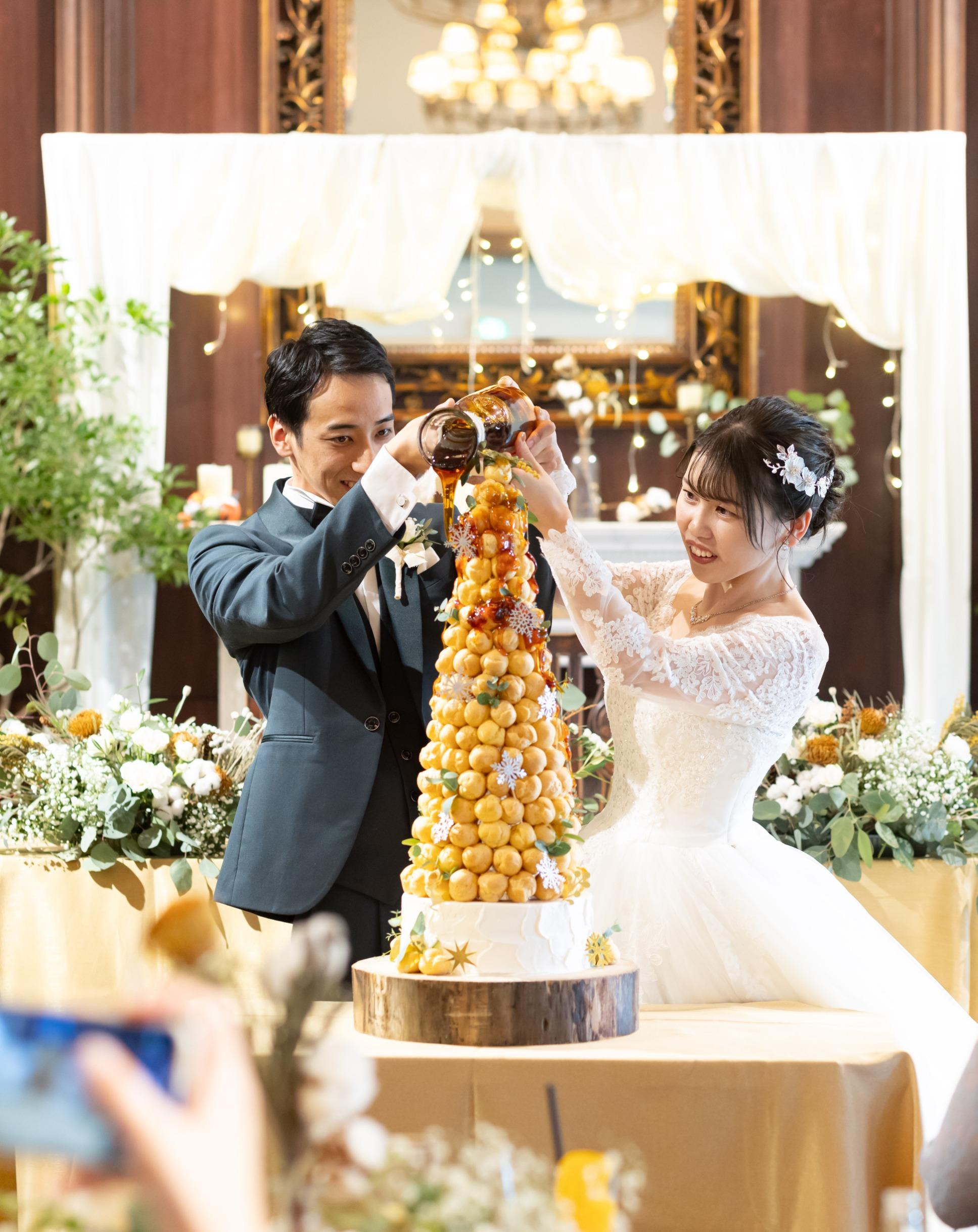 1組1組のコンセプトに合わせておふたりだけのウエディングケーキをパティシエがコーディネート もちろんウエディングケーキだけではなく、ドーナツやおにぎりなどの変わり種も可能◎ 一から一緒に考えよう!