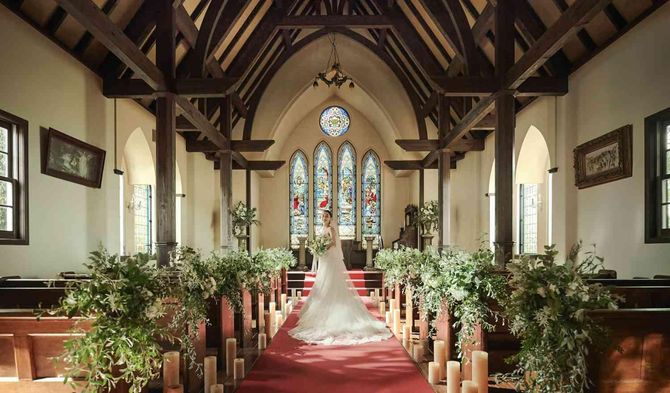 一歩入った瞬間、木の温もりや息づく歴史にハッとするチャペルです。英国教会で使用された色とりどりのガラスを使った本物のステンドグラスや、150年前のリードオルガンなどアンティークチャペルで心に残る誓いが叶います。
