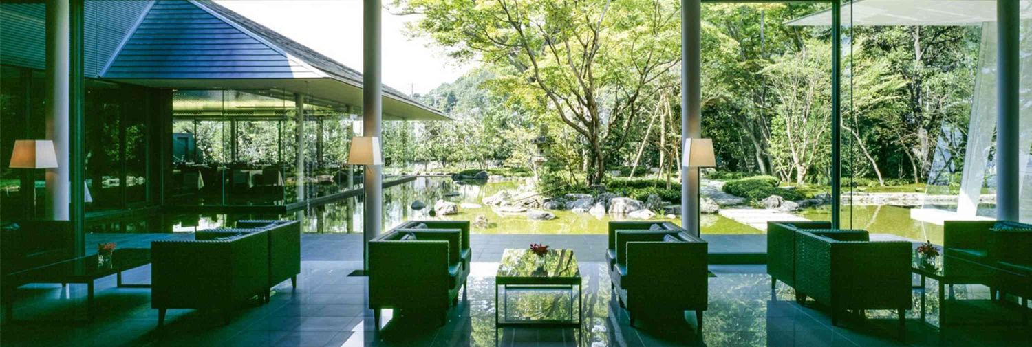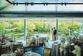 - 自然に囲まれた、四季彩る会場。ガラスの外に広がる景色と調和する和モダン建築で、美しいひとときを。