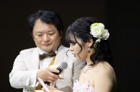お色直し入場は階段からのサプライズ入場! お二人お気に入りの大階段からマッピングと共に華やかな登場です 「ナナイロ」に輝く虹色のドレスに身を包み、より一層華やかな披露宴後半戦 そして披露宴中にはスタッフへサプライズが! プランナー・美容スタッフ・カメラマンにひとりひとりにコメントとプレゼントを 様々な愛に溢れたこの一日はこの場にいる全員が「ナナイロ」以上の感情に包まれた素敵な一日でした