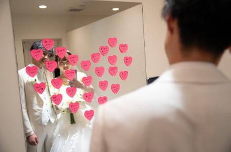 新婦様から新郎様へ「ミラーメッセージ」のサプライズ! 新郎様の大好きなところを沢山書いて大きなハートを作ります 大切な一日の始まりに新婦様からの沢山の愛を実感した新郎様 ファーストミートでは 新郎様から新婦様へ「お手紙と花束」のサプライズ! 思ってもいなかったプレゼントに新婦様も笑顔が溢れます 大きな白亜の大聖堂での結婚式は 生歌生演奏の迫力により一層華やかに彩られました