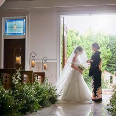 《隠れ家のように佇むチャペルで入場体験》プライベートガーデンの先に立つ独立型のチャペル。シンプルながら建物2階相当の天井高が圧迫感を感じさせない特別な空間。挙式後はガーデンでの開放的な演出も人気♪