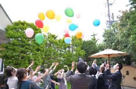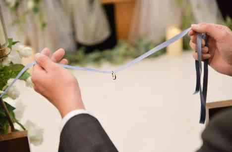 挙式ではお二人の指輪をゲストの皆様に運んでいただく 「リングリレー」を実施されました。 新郎様側、新婦様側のゲストのお席に青とピンクのリボンを1本ずつ用意し、そのリボンをそれぞれの指輪が通ってお二人の元へと届きました。 ゲストの皆様でご一緒に参加していただける心あたたまる演出でした! その後のアフターセレモニーでは、バルーンリリースなどもご実施され、たのしい挙式となりました♪