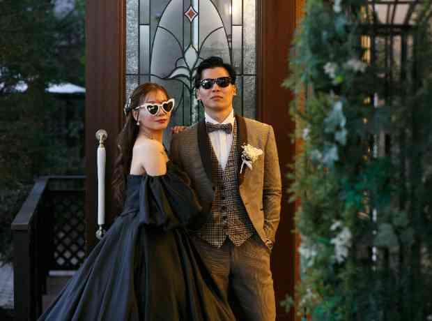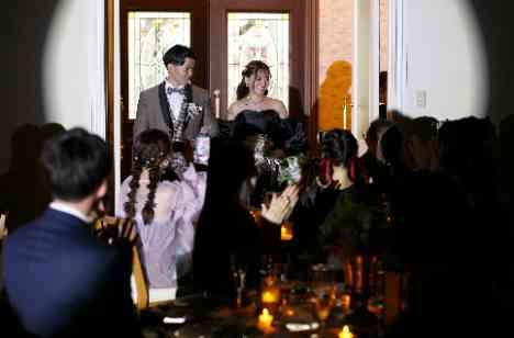 お色直し入場前、キャンドルをゲスト1人ずつテーブルにご用意され点灯をしていただきました。 暗い会場には60個のキャンドルが光り輝きとても綺麗で幻想的な空間に包まれました。 お色直しででは「あなた以外の色には染まらない」といった意味を持つブラックドレスでご入場。 幻想的な空間をおふたりでラウンドをしていただきました。