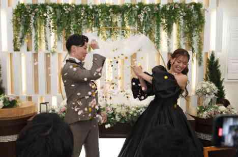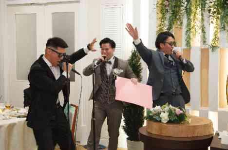 ご友人様より結婚式にてサプライズで余興をしたいとご連絡をいただき、新郎新婦様には当日まで内容を秘密に打ち合わせを進めさせていただきました。 替え歌を作成され新郎新婦様の写真が使われた素敵なムービーを上映しながら歌とダンスを披露していただきました! 終盤では新郎様も参加され歌をご披露いただきました。 会場は手拍子と合いの手で大盛り上がりでございました。