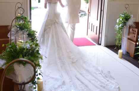 美しいロングトレーンのウェディングドレスでチャペルでのご結婚式を行われました。ご入場の際はトレーンガール・ボーイにもお手伝いいただきました。ロングトレーンのウェディングドレスでバージンロードを歩く美しい姿に大注目となりました。