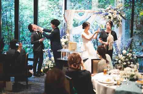 ウエディングケーキ入刀後のサンクスバイトでは、くじ引きでゲストをお呼びになり、感謝の気持ちを込めた一口を。また、おふたりオリジナルの参加型ゲームとして考えられた「似顔絵ゲーム」も大盛り上がり!一番似ている絵を描いたテーブルの皆様にプレゼントをお渡しされ、全員が参加できて大変盛り上がる演出となりました。そして、「ゲストとの時間」を多くとる進行で終始ゲストの楽しそうな笑顔が溢れました。