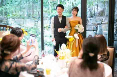 お色直し入場では、披露宴会場のテーマカラーでもある“イエロー”のカラードレスにお召替えをされた新婦様。上品かつエレガントなおふたりのお姿に、会場中が魅了されていました。披露宴の結びでは、翌日の『母の日』にちなんで、カーネーションとガーベラを用いた花束をご両家のお母様へ。おふたりの感謝と愛情が伝わった、ぬくもりあふれる一日となりました。