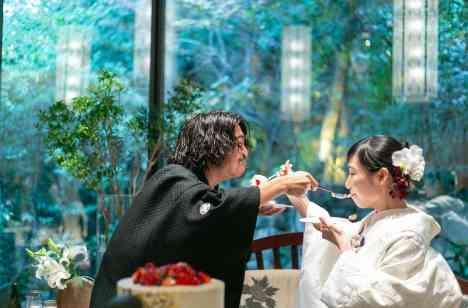 挙式の前にはガーデンにて、おふたりだけのファーストミート。 誓いの時に向けて、おふたりの心が一つとなるひとときを過ごされました。 挙式スタイルは、ゲストに愛を誓う“人前和婚式”。 親御様とのご入場、“筥迫の儀”では、親御様との一瞬一瞬を心に刻まれているご様子でした。 また、お子様ゲストのご協力により、和やかな雰囲気にも。 たくさんのゲストの祝福に包まれながら、永遠の愛を誓われました。