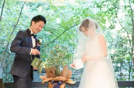 ご参列いただくゲストの皆様に誓いをたてる人前式を選ばれたおふたり。自由な演出を取り入れることができる人前式で、おふたりはオリーブの木を使って水合わせをされました。 オリーブの木は夫婦の木とも言われ、花言葉には平和・安らぎという意味をもち、水合わせとはおふたりのご出身の土地の水をひとつに合わせる日本の伝統的な儀式。 結婚式の意味も大切にしながら、オリジナリティも出してくださいました。