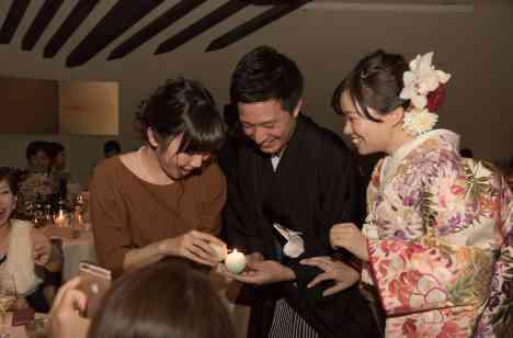 京都でのご結婚式だからこそ、お色直しは淡いやわらかな印象の色打掛をお選びになり、ゲストのテーブルを回りながら、キャンドルリレーをなさいました。新郎新婦からの灯火を皆様でつなぎ、全員で願いをこめ、ふきけし、会場全体に一体感が生まれます。終盤は夕暮れ時でもあったため、昼と夜の両方を楽しむ披露宴となりました。