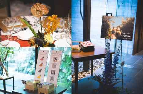 受付の際に、オリジナルデザインのリストバンドやチケット風のエスコートカードをゲストにお配りし、“フェス”感を演出。心が躍るようなペーパーアイテムは、これからはじまるパーティへの期待感をさらに高めました。そしてウエルカムスペースにはウエディングキャンバスをご用意。祝福の想いを筆にこめながら丁寧に描かれているご様子でした。披露宴会場はイエローのフラワーで彩り、華やぎとあたたかみのあるコーディネートに。