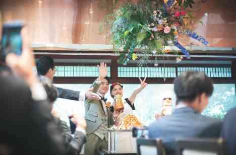 ゲストの乾杯のご発声により、華やかにスタートした祝いの宴。グラスを傾けながら、さっそく会話に花を咲かせられていました。そして、会場中の視線を奪ったのは、ピラミッド型に積み上げられたたくさんの串団子。そのうえから新郎様と新婦様がみたらしソースをかけ、みたらし団子が完成。京都らしい“和”の要素を採り入れた演出に、会場も大盛り上がりでした。