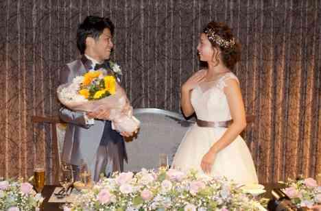 ご友人からお祝いのサプライズムービーに感動される新婦様。ムービーの最後にお誕生日おめでとうのメッセージが…ご結婚式当日は新婦様のお誕生日だったのです。そして、ムービーの後、新郎様からサプライズのバースデープレートと花束!新婦様には内緒で、新郎様がご準備くださり、披露宴はより一層、幸せな空間になりました。