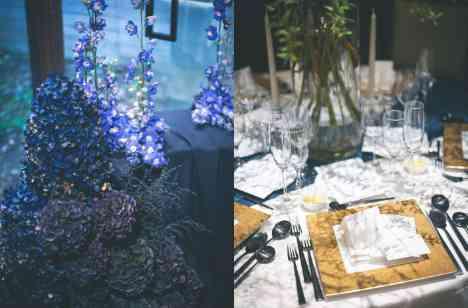 披露宴会場を彩るテーマカラーは藍色。結婚式のテーマ“アイ巡る”の通り、会場を美しい藍色で染められました。黄昏時からスタートする披露宴は、会場コーディネートの雰囲気も相まって、神秘的な雰囲気を醸成。ゲストの皆様は、これからはじまるパーティに胸を躍らせているご様子でした。洋装姿にお召替えされた新郎様新婦様のご登場により、華々しくパーティがスタートしました。