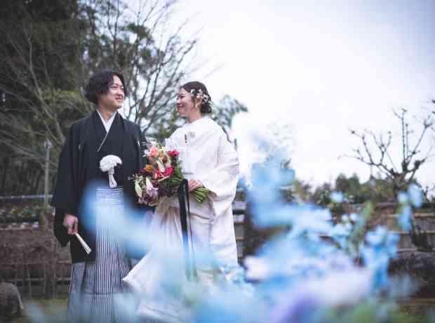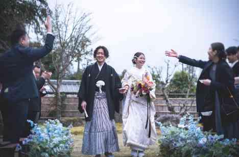 柔らかな光が降り注ぎ、緑が輝く月真院のガーデン。新婦様はお父様にエスコートされ、祝福の中バージンロードを歩みます。誓いの指輪を運ぶのは、可愛らしいリングガールを務めたお子様ゲスト。会場には自然と笑顔が広がりました。お母様には娘への最後の支度として「扇の儀」を行っていただき、家族の絆を感じる感動のひとときに。ラストはブーケトス。青空に放たれたブーケに歓声があがり、笑顔あふれるセレモニーとなりました
