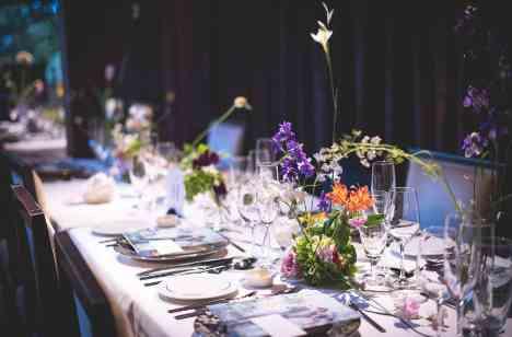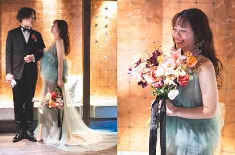 「枠にとらわれない、ふたりだけの結婚式」という想いは、会場の隅々にまで息づいていました。クリエイターと創り上げたのは、ナチュラルな温もりに鮮やかな差し色が映える、唯一無二のアート空間。テーブルには、黄色をアクセントに紫やオレンジ、白、ピンクの花々が咲き誇り、まるで庭園のよう。遊び心と洗練されたセンスが共存する空間は、「no title」というおふたりのメッセージを、言葉以上に物語っていました。