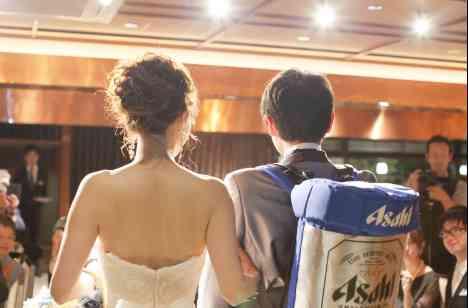 お色直しでウェディングドレスとタキシード姿でご入場。新郎様の背にはビールサーバー!これにはゲストもびっくり!感謝のお言葉と共にビールサーブされる姿に親族の方も大変喜んでくださいました。お酒が好きな親御様やゲストの皆様の笑顔があふれる一日となりました。