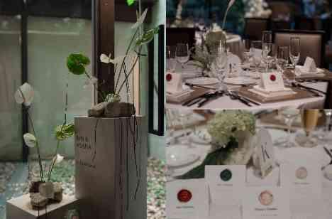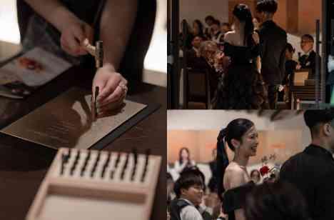 おふたりが選ばれた、真鍮素材を用いたスタイリッシュな結婚証明書。シンプルながらも存在感のある証明書には、「これからも一緒に歩むチームとしての絆を大切にしたい」という想いが込められています。当日は、受付でゲスト様にも刻印を入れていただき、みんなで作り上げる特別な証明書に。署名する瞬間の緊張と喜び、そしてゲストの想いが重なり合う時間は、おふたりらしい温かさが印象的なワンシーンとなりました。