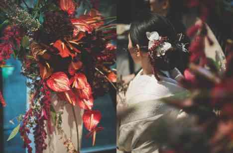 披露宴会場を彩るのは「hanamari production」による装花。クリエイターと打ち合わせを重ね、凛とした空気の中に遊び心を添えた唯一無二の空間が完成しました。お料理は京都の食文化を堪能する「東山コース」。そこへ新郎様の故郷、岡山の大吟醸が華を添えます。おふたりが吟味した珠玉の一杯と旬の料理。細部までおもてなしの心を尽くしたひとときは、ゲストの心とお腹を優しく満たす至福の時間となりました。