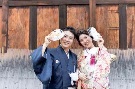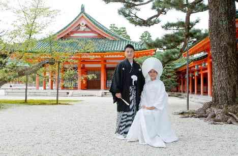 挙式は日本人らしく和装でされたい、というご希望をお持ちだったおふたり。場所は京都を代表する寺社仏閣の1つである平安神宮をお選びになられました。平安神宮での神前式では紋付と白無垢をお召しになり、特別で厳かな雰囲気の中、夫婦としての誓いを結ばれました。挙式後には平安神宮の絶好のロケーションのもと、沢山お写真撮影も愉しまれていました。