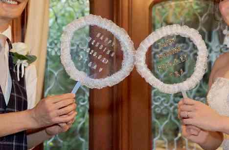 当日は「大切な家族とお料理とお酒を楽しみながらゆっくり寛いでほしい」とのご希望に合わせて、おふたりとご家族全員で一テーブルを囲むコーディネートをご準備。また、お互いに顔を合わせるからこそ飛沫感染防止にオリジナルクリアうちわをご用意されました。おふたりのイニシャル入りのうちわは、お話をする際には口元にあてることで感染症対策になるだけでなく、表情もしっかり見えてお写真のアイテムとしても大活躍でした!