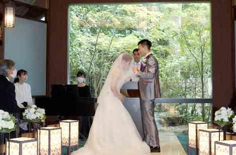 挙式はチャペルにてキリスト教式を行われたおふたり。前面の窓から見えるお庭の緑にウエディングドレスが美しく映えていました。またAKAGANE RESORTのチャペルはアットホームな距離感が魅力の1つ。当日は親御様との距離感も近く、しっかりとおふたりの表情や誓いの瞬間をご覧いただけ感動のお時間となりました。