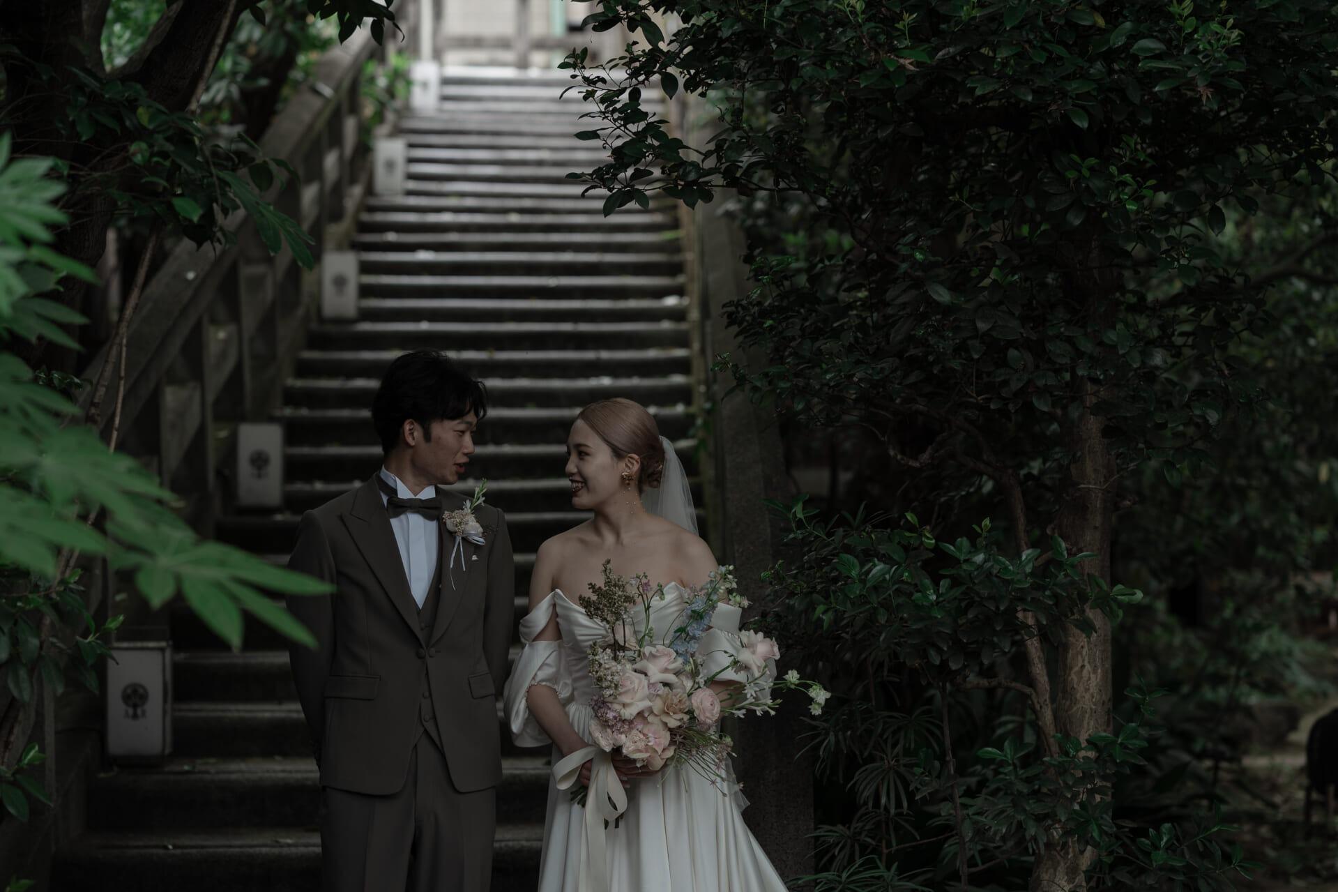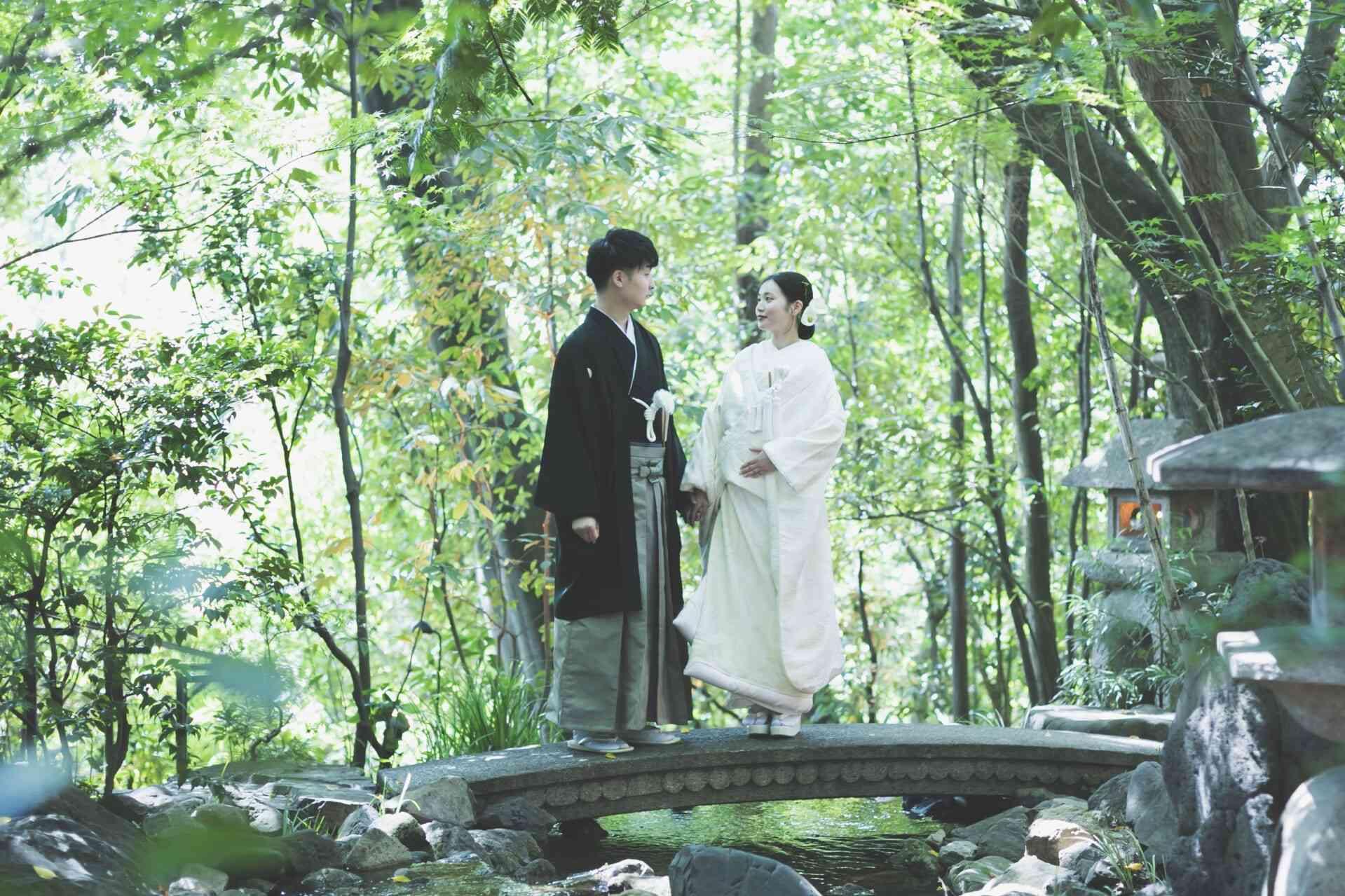 常緑樹が茂る700坪の緑と大正建築が織りなす非日常空間。京都東山の中心とは思えない静寂の森は、1年中いつでも、豊かな緑の中で記念撮影や前撮りにも人気のスポット。