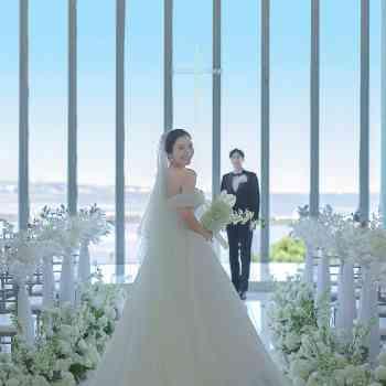 空と湖へ続くインフィニティチャペルと絶景が魅力の会場!水平線へと向かう、湖面に浮かぶようなバージンロードで空と湖の青に包まれるチャペルはSNS映え間違いなしです。