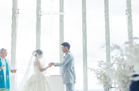 お二人が挙げたのはキリスト式。外国人の牧師先生を前に、お二人の愛を誓っていただきました。リハーサルは行ったもののやはり本番になると緊張されていた新郎様。手が震えていましたが、それを見てほほ笑む新婦様。新郎様の手を取ると、緊張がほぐれたのか自然な笑顔へと変わっていきました。そんな風にお二人はこれからもお互い助け合い人生を歩んでいくことでしょう。