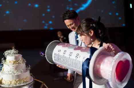楽しい宴が始まりました。ここから行われるのは、ケーキのファーストバイト!食べさせるケーキの大きさが愛の大きさだというけれど・・・なんとでてきたのは超巨大な注射器!?これにはゲストの皆様も大盛り上がり!テンションが最高潮になったところでケーキの食べさせあいをしていただきました。これからもおいしいものは共有していこうねという想いを込めてお二人のファーストバイトなのでした。