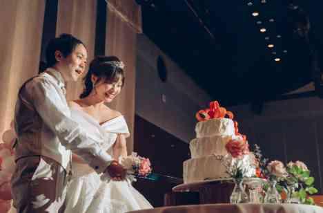 披露宴ではお二人の好きなキャラクターがのったイチゴのケーキ。デザインにもこだわったケーキです。赤いリボンのついたケーキをプレゼントを開けるかのように入刀していただきました!会場中に甘い香りが漂います。ケーキの入刀がやりたい!と夢だった新婦様。とびきりの笑顔で入刀していただきました。お二人のその笑顔がこの先もずっと続きますように。