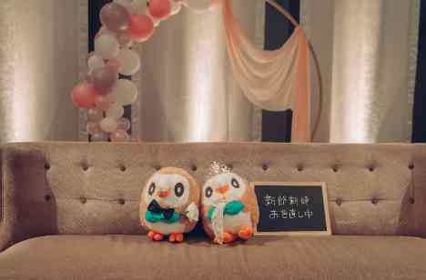 前半のお時間が過ぎお色直し中のお二人。二人ともいないと思いきや・・・高砂席にはキャラクターのぬいぐるみが!お二人が不在でもかわいい写真映えスポットになりました。ちゃんと新郎新婦仕様になっています。一緒に写真をとったりとお二人の姿が見えなくても楽しい雰囲気のお色直し中でした。この後も楽しい時間は続きます。