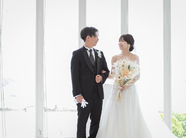 新郎様をびっくりさせたい、当日まで内緒にしていたウェディングドレス。悩みに悩んで決めたとっておきの一着を初めに見せる時間です。チャペルで先に待ち構える新郎様。後ろから肩をたたかれ振り返ると、そこには初めて見る新婦様の姿が。「すごく綺麗…」と思わず出る本音に新婦様も笑ってしまいましたね。今日は世界で一番きれいな人の隣で過ごすのがうれしいと感じた新郎様なのでした。