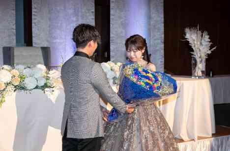 お色直し後は、皆様とお写真を撮ったり、お話をしたり余興を楽しんだりと過ごすお二人。こっそりと新郎様が何かを抱えて戻ってきました。それは新婦様へのサプライズでした。涙がでてくる新婦様。いつもありがとう、これからもどうぞよろしくね。と気持ちを込めて。いつ用意してたの!と驚きと感動的な演出に一生の思い出になった新婦様でした。