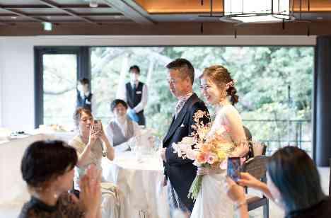 挙式では、新婦様は白無垢の下にご自前の振袖を合わせられ、世界にひとつだけの花嫁衣装をお召しになりました。おふたりの凛とした品のある佇まいに、ゲストのみならずスタッフまでもが魅了されました。神前式ならではの厳かな雰囲気のなかで式は進行され、さらに強く結ばれた夫婦と両家のご縁。格式を重んじつつも、穏やかな雰囲気に満ちた素敵な挙式となりました。