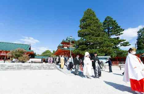 平安神宮の大鳥居を抜け應天門をくぐると、青空を背景に美しく映える朱塗りの『本殿』が目の前に広がります。本殿での挙式は、平日にしか叶えられない貴重なもの。ゲストの皆様に、他では経験できないような特別な空間を感じていただきたいと、あえて平日の挙式をお選びになりました。大切な方々に見守られながら、神様に結婚のご報告をされ、おふたりとゲストの心にも深く刻まれた、素晴らしいひとときとなりました。