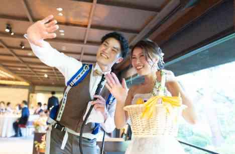 お色直しご入場は、チャペル挙式風に。とびきりの笑顔でご登場された新婦様とお父様のお姿に、おふたりの仲の良さがうかがえるにこやかなシーンとなりました。また、新郎様新婦様の中座中にゲストにフラワーレイをお配りし、皆様に身につけていただいたことで会場の雰囲気は“京都”から“沖縄”に様変わり。沖縄出身歌手の楽曲に乗せて踊りながらビールで再び乾杯され、たくさんの笑顔にあふれた忘れられない一日となりました。