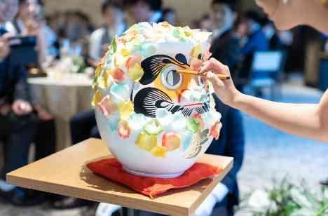 おふたりの晴れの日を彩ったのは、新郎様のご出身地である群馬県名産の“高崎だるま”。ゲストにはお好きな色の花びらを思い思いにだるまに貼り付けていただき、新郎様新婦様はそのだるまに目入れをしていただきました。ゲストとともに創り上げられた、インパクトに残る結婚証明書。新郎様の地元愛があふれた、思い出深い演出となりました。