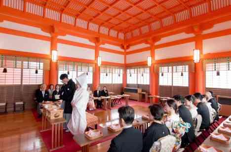 新婦様は、白無垢に洋髪スタイルでご登場。 挙式の前には泰平閣を背に写真撮影をされたり、お控室にて皆様と談笑されたりと、誓いのトキに向けてゆったりと過ごされた新郎様新婦様。 挙式では新婦様は綿帽子をお召しになり、より伝統的な花嫁姿に。 朱色の社殿におふたりの晴れ姿がよく映え、一つ一つの儀式や所作が深く印象に残る厳かな神前式となりました。